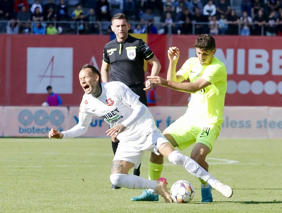Alesssandro Murgia, Julian Augusto Marchioni Garobbio si Arbitrul central Ovidiu Robu in meciul de fotbal dintre AFC Hermannstadt Sibiu si Poli Iasi, contand petru Superliga Superbet Play-Out, desfasurat pe Stadionul Municipal din Sibiu, sambata 10 mai 2025. © FOTO: Valentin Macrea/SPORT PICTURES