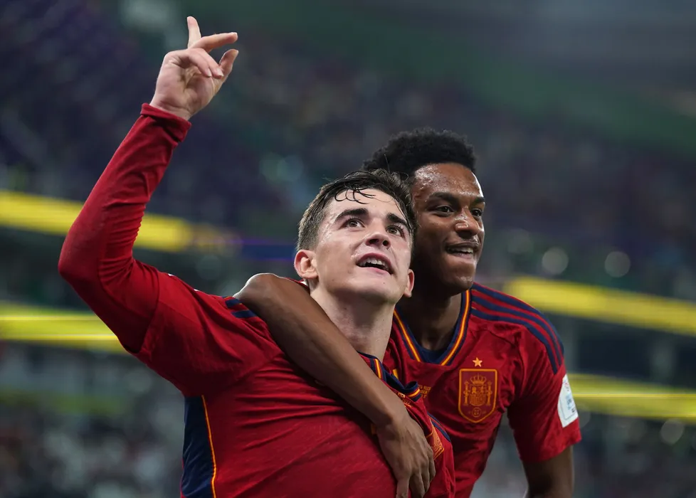 23 November 2022, Qatar, Doha: Spain's Gavi (L) celebrates scoring his side's fifth goal of the game with team-mate Jose Gaya during the FIFA World Cup Qatar 2022 Group E soccer match between Spain and Costa Rica at the Al Thumama Stadium. Photo:/PA Wire/dpa