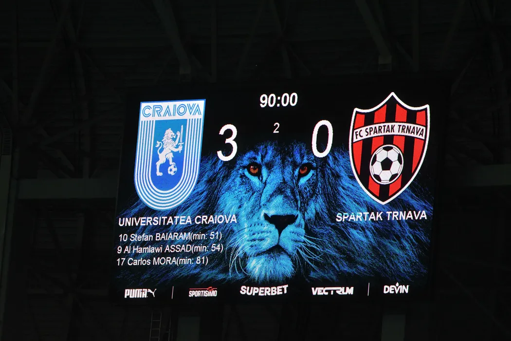 Scor final afisat pe tabela de marcaj la meciul de fotbal dintre Universitatea Craiova si Spartak Trnava, contand pentru Turul 3 Preliminar al Conference League, desfasurat pe Stadionul Ion Oblemenco din Craiova, joi 7 august 2025. © FOTO:Remus Badea/SPORT PICTURES