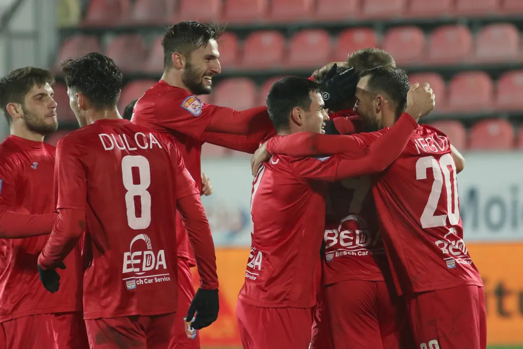 Bucurie a fotbalistilor targovisteni dupa un gol marcat cu Paul Alexandru Iacob, Marius Madalin Martac, Andrei Ovidiu Pitian si Cristian Daniel Negut in meciul de fotbal dintre FC Voluntari si Chindia Targoviste, contand pentru Liga 1 Casa Pariurilor, desfasurat fara spectatori pe Stadionul Anghel Iordanescu din Voluntari, miercuri 16 decembrie 2020. © FOTO:Gheorghe Fluster/SPORT PICTURES