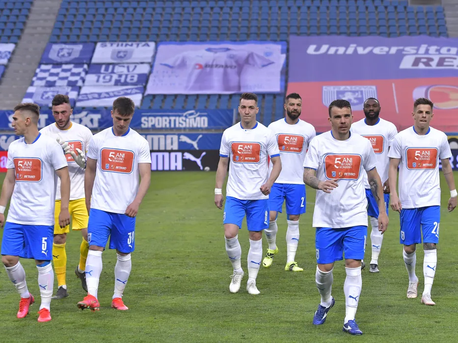 Fotbalistii craioveni Bogdan Ilie Vatajelu, Mirko Pigliacelli, Ionut Radu Mitran,Alexandru Mateiu, Marius Marcel Constantin, Dan Nicolae Nistor, Stephane Ghislain Acka si Alexandru George Cimpanu la startul meciului de fotbal dintre Universitatea Craiova si FCSB, contand pentru Play-off-ul Ligii 1 Casa Pariurilor, desfasurat fara spectatori pe Stadionul Ion Oblemenco din Craiova, joi 29 aprilie 2021. © FOTO:Razvan Pasarica/SPORT PICTURES