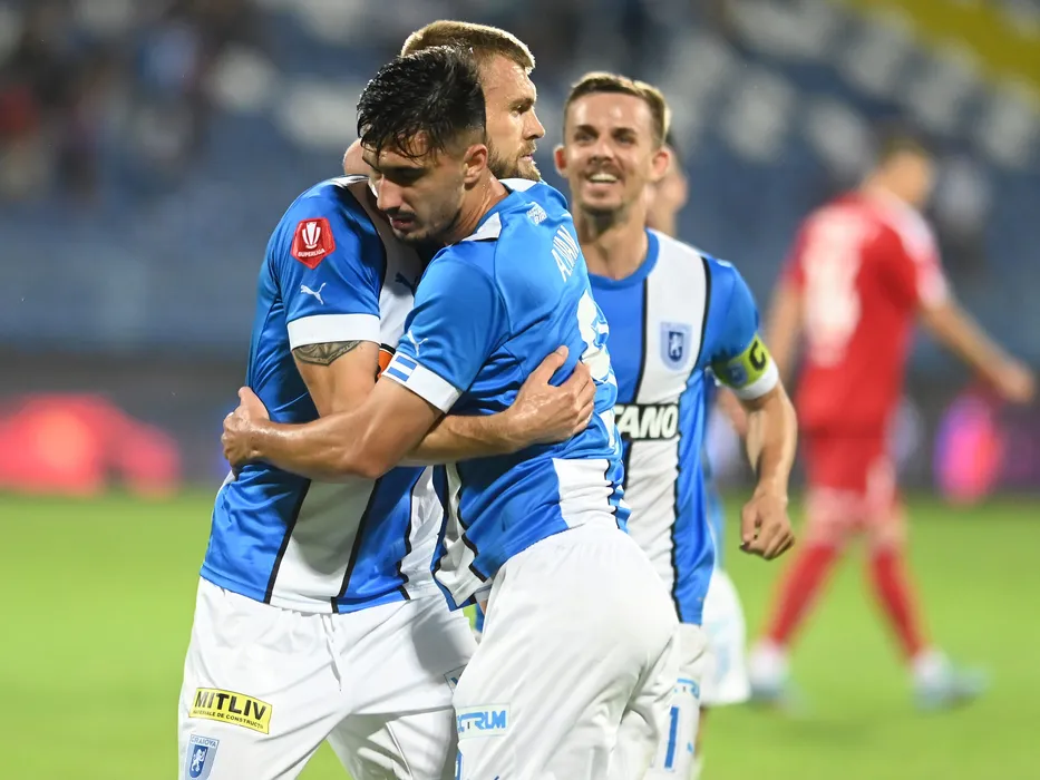 Alexandru Cretu se bucura dupa un gol marcat alaturi de Andrei Virgil Ivan si Nicusor Silviu Bancu in meciul de fotbal dintre Universitatea Craiova si FC Botosani, contand pentru Superliga Superbet, desfasurat pe Stadionul Municipal din Drobeta Turnu Severin, luni 29 august 2022. © FOTO:Razvan Pasarica/SPORT PICTURES