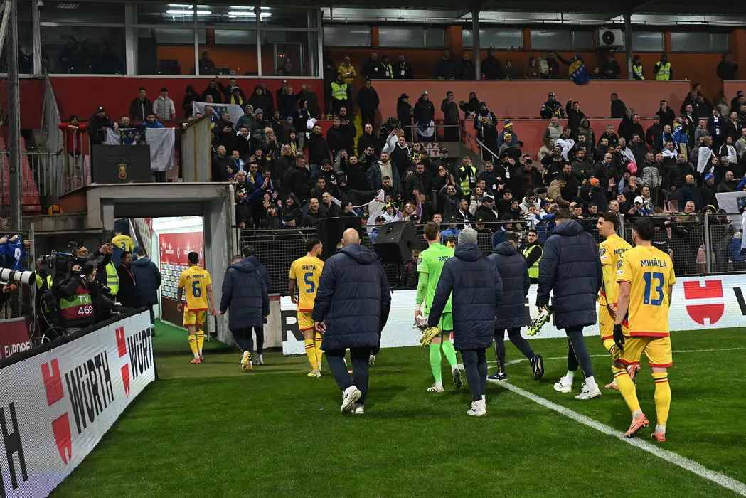 Fotbalistii romani parasesc tristi terenul dupa meciul de fotbal dintre Bosnia Hertegovina si Romania, din cadrul Preliminariilor Campionatului Mondial 2026, desfasurat pe Stadionul Bilino Polje din Zilina, sambata 15 noiembrie 2025. © FOTO:Razvan Pasarica/SPORT PICTURES