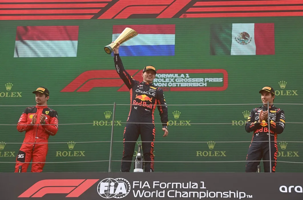 (L-R) Second placed Ferrari's Monegasque driver Charles Leclerc, winner Red Bull Racing's Dutch driver Max Verstappen and third placed Red Bull Racing's Mexican driver Sergio Perez celebrate on the podium after the Formula One Austrian Grand Prix at the Red Bull race track in Spielberg, Austria on July 2, 2023.,Image: 786756395, License: Rights-managed, Restrictions: , Model Release: no