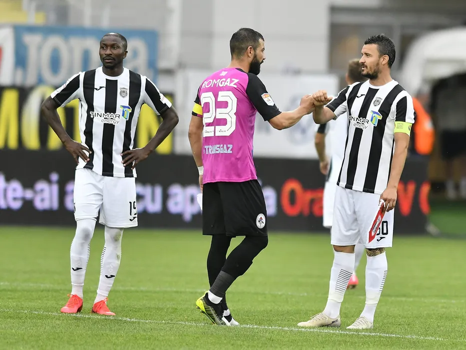 Marius Marcel Constantin se saluta cu Constantin Budescu sub privirile lui Kehinde Fatai la meciul de fotbal dintre Astra Giurgiu si Gaz Metan Medias, contand pentru play-off-ul Ligii 1 Casa Pariurilor, disputat fara spectatori pe Stadionul Marin Anastasovici din Giurgiu, luni 15 iunie 2020. © FOTO:Razvan Pasarica/SPORT PICTURES
