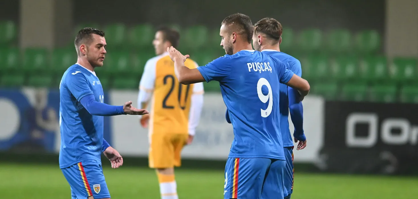 Alexandru Cicâldău si George Pușcaș se bucura dupa un gol marcat in meciul amical de fotbal dintre Moldova si Romania, desfasurat pe Stadionul Zimbru din Chisinau, duminica 20 noiembrie 2022. © FOTO:Razvan Pasarica/SPORT PICTURES