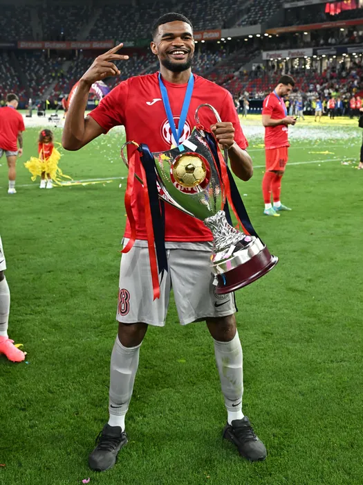Malcolm Edjouma pozeaza alături de trofeu dupa meciul dintre FCSB si Corvinul Hunedoara, Supercupa Romaniei, desfasurat pe Stadionul Steaua-Ghencea din Bucuresti, joi 4 iulie 2024. © FOTO:Razvan Pasarica/SPORT PICTURES