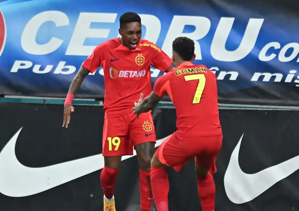 Florinel Teodor Coman îl felicită pe Luis Phelipe De Souza Figueiredo dupa un gol marcat în meciul de fotbal dintre FCSB si Petrolul Ploiesti, contând pentru Superliga Superbet, desfășurat pe Arena Nationala din Bucuresti, duminica 3 martie 2024. © FOTO: Răzvan PĂSĂRICĂ/SPORT PICTURES