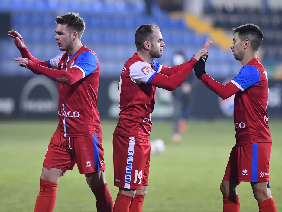 Fotbalistii botoseneni Denis Gratian Harut, Andrei Alexandru Patache si Eduard Marian Florescu se bucura dupa meciul de fotbal dintre FC Viitorul Constanta si FC Botosani, contand pentru Liga 1 Casa Pariurilor, desfasurat fara spectatori pe Stadionul Central al Academiei Gheorghe Hagi din Ovidiu, marti 15 decembrie 2020. © FOTO:Razvan Pasarica/SPORT PICTURES