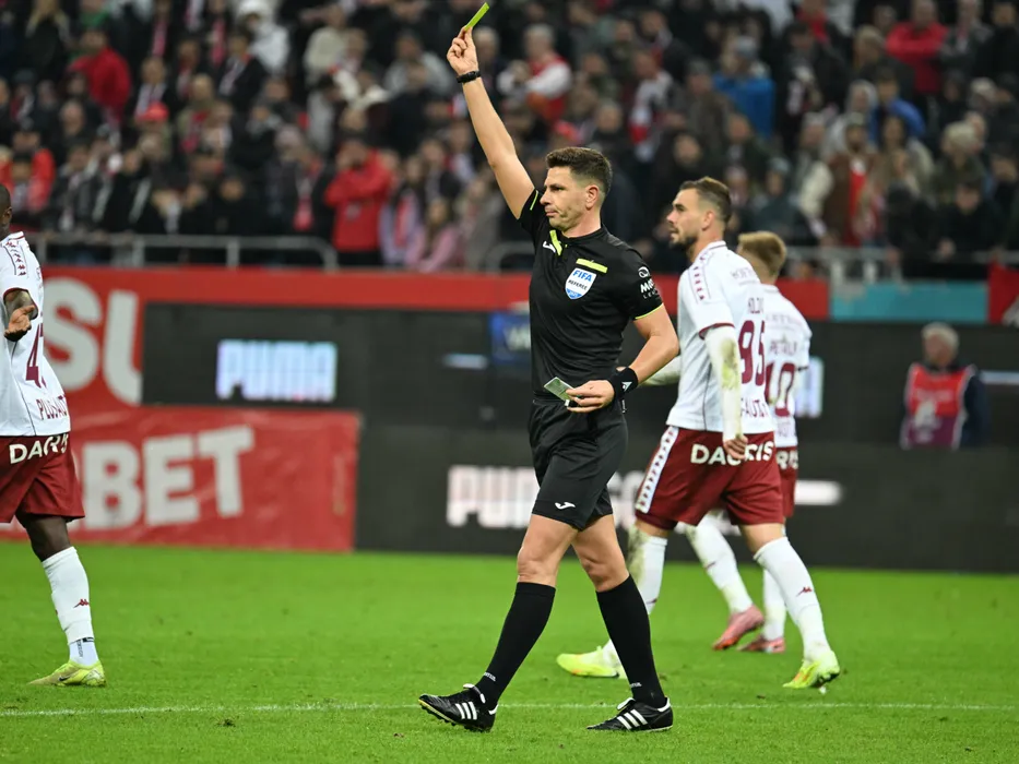 Arbitrul central Marian Barbu acordă un cartonaș galben in meciul de fotbal dintre Dinamo Bucuresti si Rapid Bucuresti, din cadrul Superligii Superbet, desfasurat pe Arena Nationala din Bucuresti, duminica 19 octombrie 2025. © FOTO:Razvan Pasarica/SPORT PICTURES