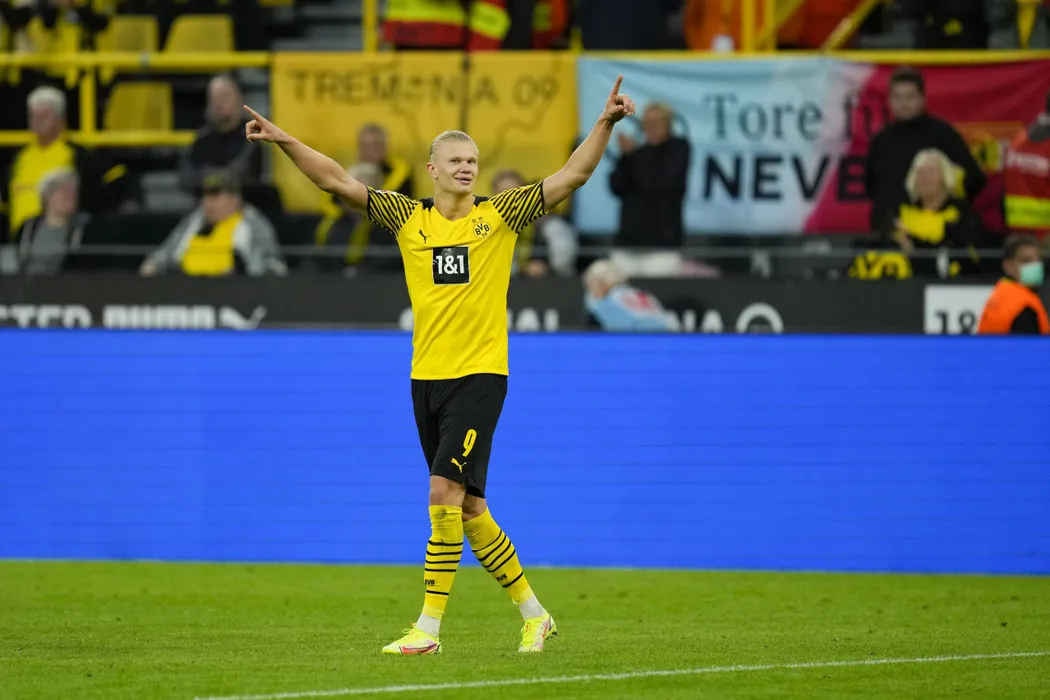 DORTMUND, GERMANY - SEPTEMBER 19: (BILD OUT) Erling Haaland of Borussia Dortmund celebrates after scoring his team's fourth goal during the Bundesliga match between Borussia Dortmund and 1. FC Union Berlin at Signal Iduna Park on September 19, 2021 in Dortmund, Germany. (Photo by Alex Gottschalk/DeFodi Images via Getty Images)