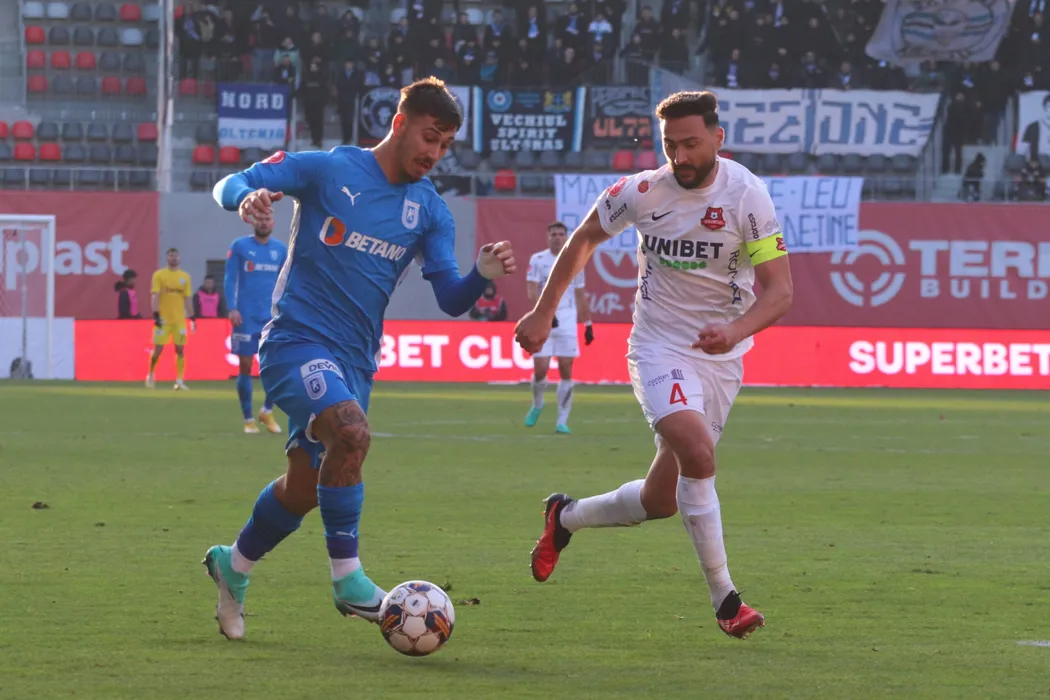 Jovan Markovic și Ionuț Stoica în meciul de fotbal dintre AFC Hermannstadt Sibiu si Universitatea Craiova, contând pentru Superliga Superbet, desfășurat pe Stadionul Municipal din Sibiu, duminică 10 decembrie 2023. © FOTO: Valentin MACREA/SPORT PICTURES