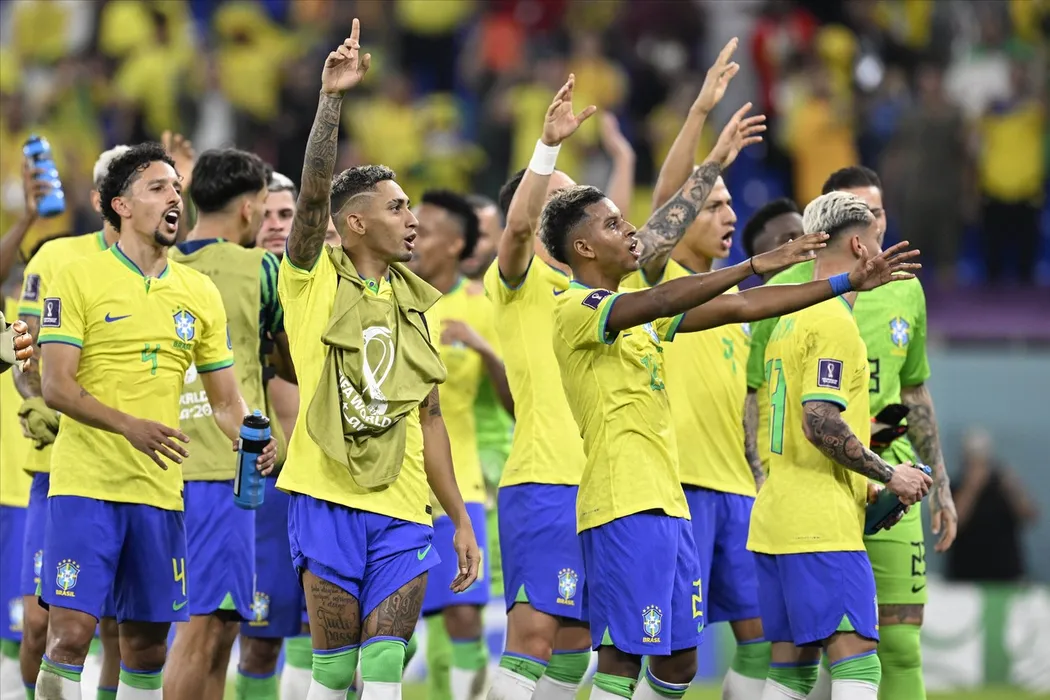 DOHA, QATAR - NOVEMBER 28 : Raphinha forward of Brasil, Rodrygo forward of Brasil celebrates qualifying for the next round during the FIFA World Cup Qatar 2022 Group F match between Brazil and Switzerland at the 974 Stadium on November 28, 2022 in Doha, Qatar, 28/11/2022 (,Image: 740776132, License: Rights-managed, Restrictions: , Model Release: no