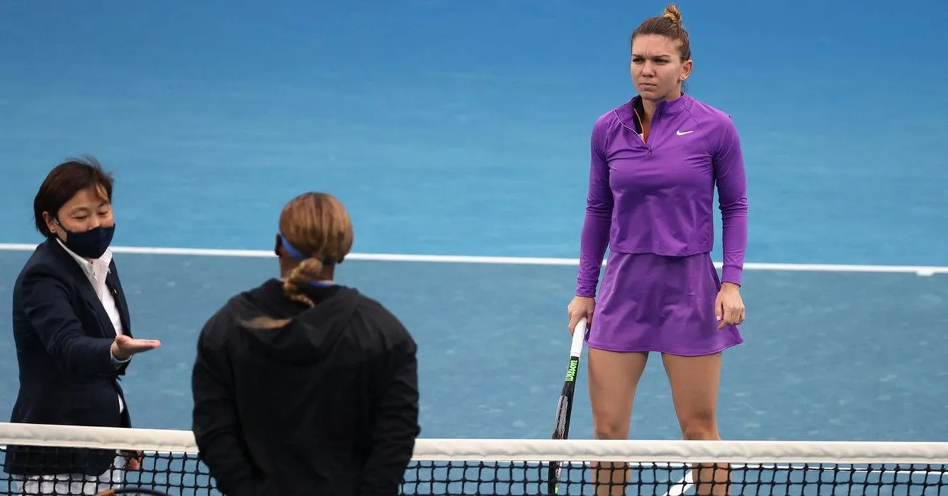 The umpire speaks to Serena Williams of the US (C) and Romania's Simona Halep before their women's singles quarter-final match on day nine of the Australian Open tennis tournament in Melbourne on February 16, 2021.,Image: 591295309, License: Rights-managed, Restrictions: -- IMAGE RESTRICTED TO EDITORIAL USE - STRICTLY NO COMMERCIAL USE --, Model Release: no