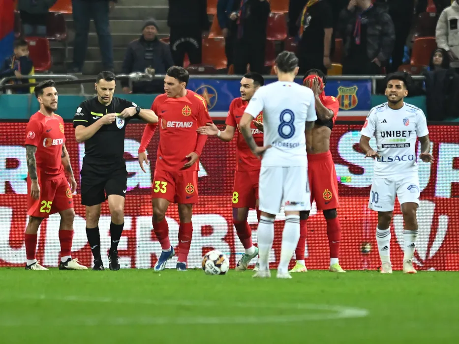 Arbitrul central Catalin Busi acordă un cartonaș roșu lui Nana Kwame Antwi sub privirile lui Alexandru Mihail Baluță, Adrian Gheorghe Șut, Risto Radunovic si Juan Cruz Kaprof în meciul de fotbal dintre FCSB si FC Botosani, contând pentru Superliga Superbet, desfășurat pe Arena Nationala din Bucuresti, duminica 25 februarie 2024. © FOTO: Răzvan PĂSĂRICĂ/SPORT PICTURES