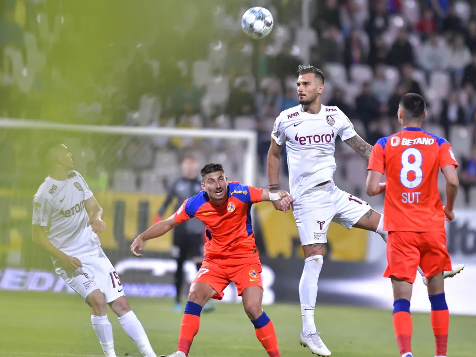 Iulian Lucian Cristea si Marko Dugandzic in meciul de fotbal dintre FCSB si CFR Cluj, contand pentru Play-off-ul Ligii 1 Casa Pariurilor, desfasurat pe Stadionul Gloria din Buzau, duminica 22 mai 2022. © FOTO:Razvan Pasarica/SPORT PICTURES