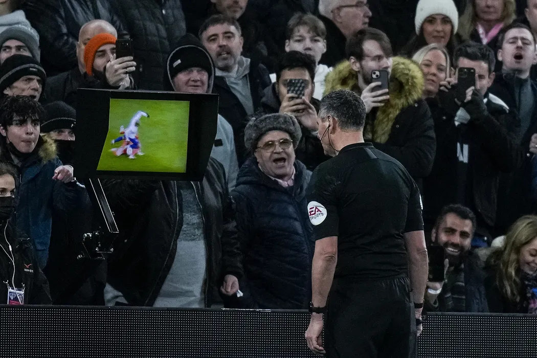 A referee checks the VAR screen during the English League Cup semifinal second leg soccer match between Tottenham Hotspur and Chelsea at the Tottenham Hotspur Stadium in London, Wednesday, Jan. 12, 2022. (AP Photo/Alastair Grant)
