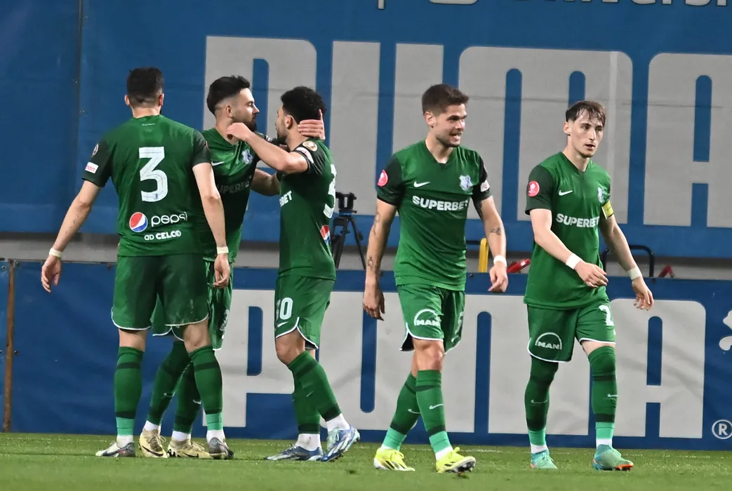 Bucurie a fotbalistilor constanteni Diogo Lucas Queiros, Ionuț Sebastian Cojocaru, Constantin Grameni, Mihai Popescu si Narek Grigoryan dupa un gol marcat în meciul de fotbal dintre Universitatea Craiova si Farul Constanta, contând pentru Play off-ul Superligii Superbet, desfășurat pe Stadionul Ion Oblemenco din Craiova, vineri 12 aprilie 2024. © FOTO: Răzvan PĂSĂRICĂ/SPORT PICTURES