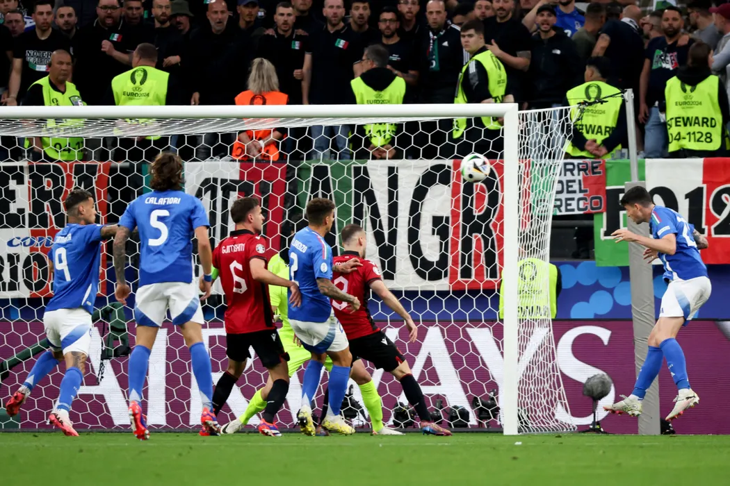 15 June 2024, North Rhine-Westphalia, Dortmund: Italy's Alessandro Bastoni (R) scores his side's first goal during the UEFA Euro 2024 group B soccer match between Italy and Albania at the Dortmund stadium. Photo: Friso Gentsch/dpa/HEPTA/SPORT PICTURES
