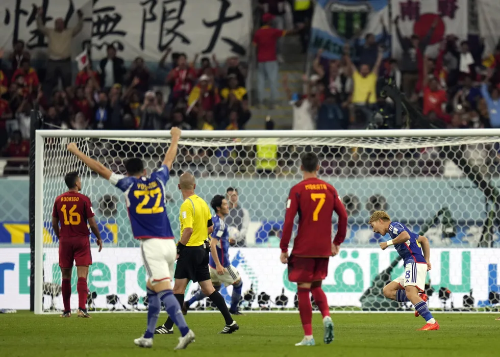 Japan's Ritsu Doan (8) celebrates after scoring a goal during the World Cup group E soccer match between Japan and Spain, at the Khalifa International Stadium in Doha, Qatar, Thursday, Dec. 1, 2022. (AP Photo/Aijaz Rahi)