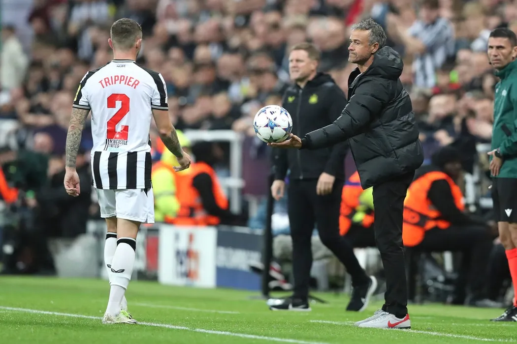 PSG's head coach Luis Enrique hands the ball to Newcastle's Kieran Trippier during the Champions League group F soccer match between Newcastle and Paris Saint Germain at St. James' Park, Wednesday, Oct. 4, 2023, in Newcastle, England.,Image: 810962276, License: Rights-managed, Restrictions: This content is intended for editorial use only. For other uses, additional clearances may be required., Model Release: no, Pictured: Kieran Trippier,Luis Enrique