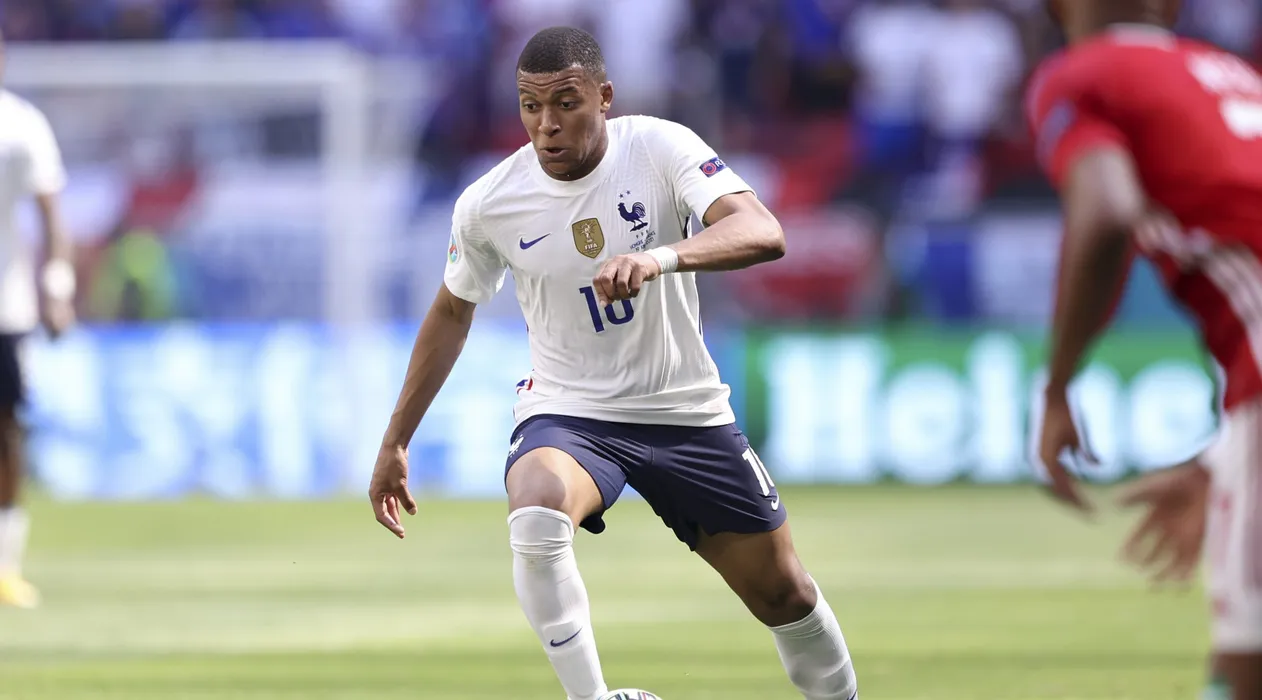 France's Kylian Mbappe goes for the ball during the Euro 2020 soccer championship group F match between Hungary and France, at the Ferenc Puskas stadium, in Budapest, Saturday, June 19, 2021. (Alex Pantling, Pool via AP)
