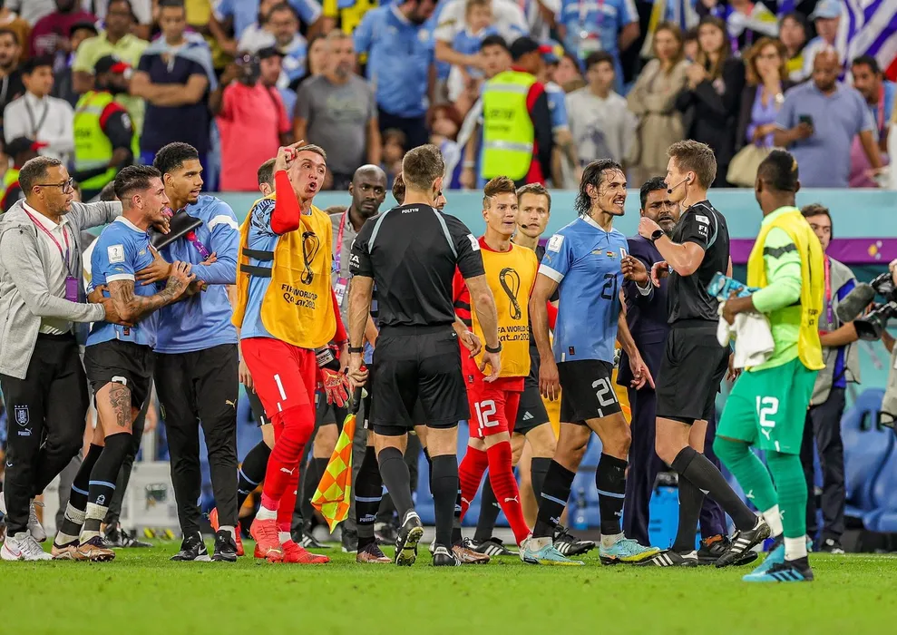 Uruguay playrs hound the referee at full time during the 2022 Fifa World Cup match between Ghana and Uruguay at Al-Janoub Stadium, Al-Wakrah