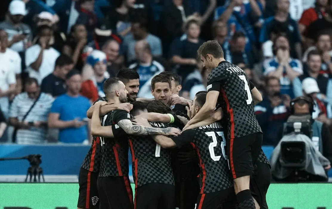 Croatia's Luka Modric celebrates with teammates after scoring his side's opening goal during the UEFA Nations League soccer match between France and Croatia at the Stade de France in Saint Denis near Paris, Monday, June 13, 2022. (AP Photo/Thibault Camus)