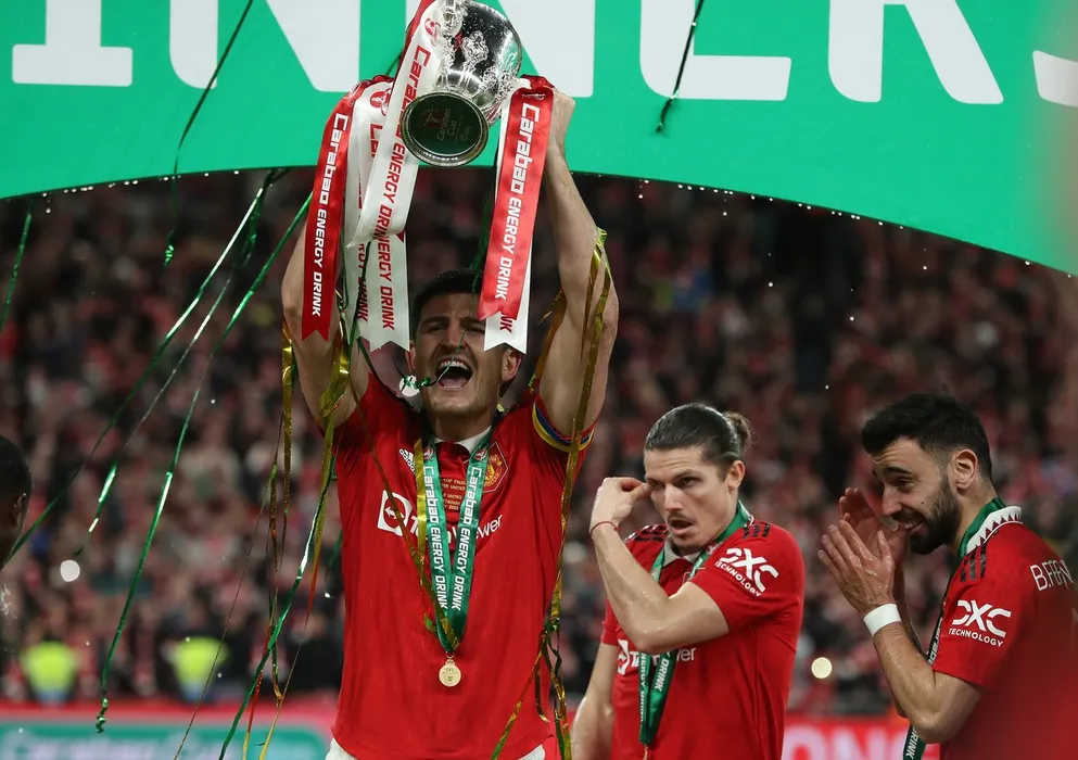 February 26, 2023, London: London, England, 26th February 2023. Harry Maguire of Manchester United lifts the trophy after Manchester United win during the Carabao Cup match at Wembley Stadium, London.,Image: 758860361, License: Rights-managed, Restrictions: * United Kingdom Rights OUT *, Model Release: no