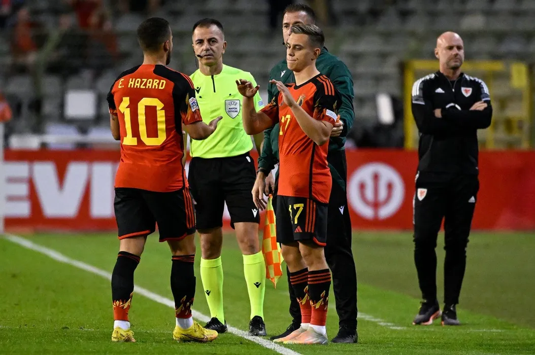 Belgium's Eden Hazard and Belgium's Leandro Trossard pictured during a soccer game between Belgian national team the Red Devils and Wales, Thursday 22 September 2022 in Brussels, game 5 (out of six) in the Nations League A group stage.