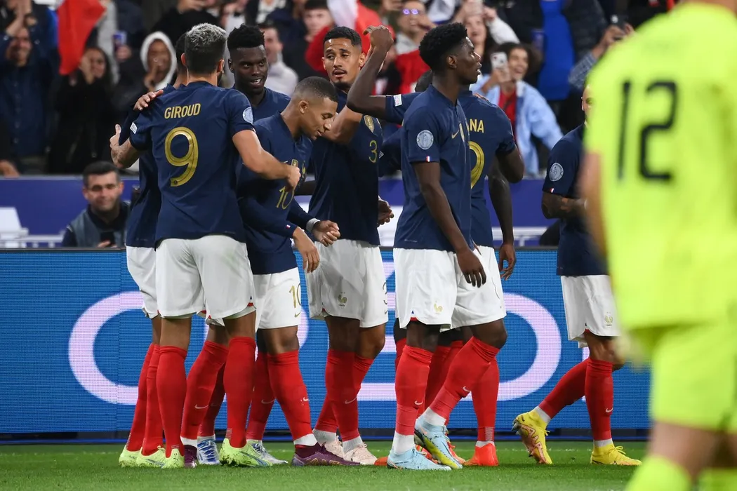 France's forward Kylian Mbappe (C) celebrates with teammates after scoring during the UEFA Nations League, League A Group 1 football match between France and Austria at Stade de France in Saint-Denis, north of Paris, on September 22, 2022.,Image: 725327647, License: Rights-managed, Restrictions: , Model Release: no