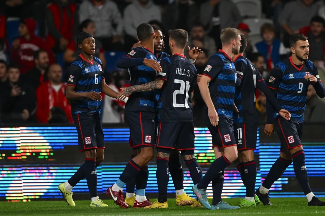 Luxembourg’s forward Marvin Martins (C) celebrates with teammates after scoring a goal during the Nations League League C Group 1 football match between Turkey and Luxembourg at Basaksehir Fatih Terim Stadium in Istanbul on September 22, 2022.,Image: 725325435, License: Rights-managed, Restrictions: , Model Release: no