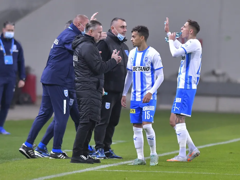 Laurentiu Aurelian Reghecampf discuta cu Lyes Hafid Houri si Alexandru George Cimpanu in meciul de fotbal dintre Universitatea Craiova si CS Mioveni, contand pentru Liga 1 Casa Pariurilor, desfasurat pe Stadionul Ion Oblemenco din Craiova, sambata 30 octombrie 2021. © FOTO:Razvan Pasarica/SPORT PICTURES