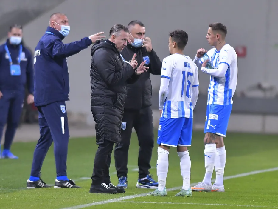 Laurentiu Aurelian Reghecampf discuta cu Lyes Hafid Houri si Alexandru George Cimpanu in meciul de fotbal dintre Universitatea Craiova si CS Mioveni, contand pentru Liga 1 Casa Pariurilor, desfasurat pe Stadionul Ion Oblemenco din Craiova, sambata 30 octombrie 2021. © FOTO:Razvan Pasarica/SPORT PICTURES