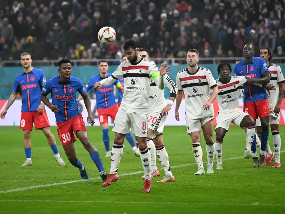 Siyabonga Ngezana, Bruno Fernandes, Diogo Dalot, Matthijs de Ligt, Kobbie Mainoo si Joyskim Aurelien Dawa Tchakonte in meciul de fotbal dintre FCSB si Manchester United, din cadrul UEFA Europa League, desfasurat pe Arena Nationala din Bucuresti, joi 30 ianuarie 2025. © FOTO:Razvan Pasarica/SPORT PICTURES