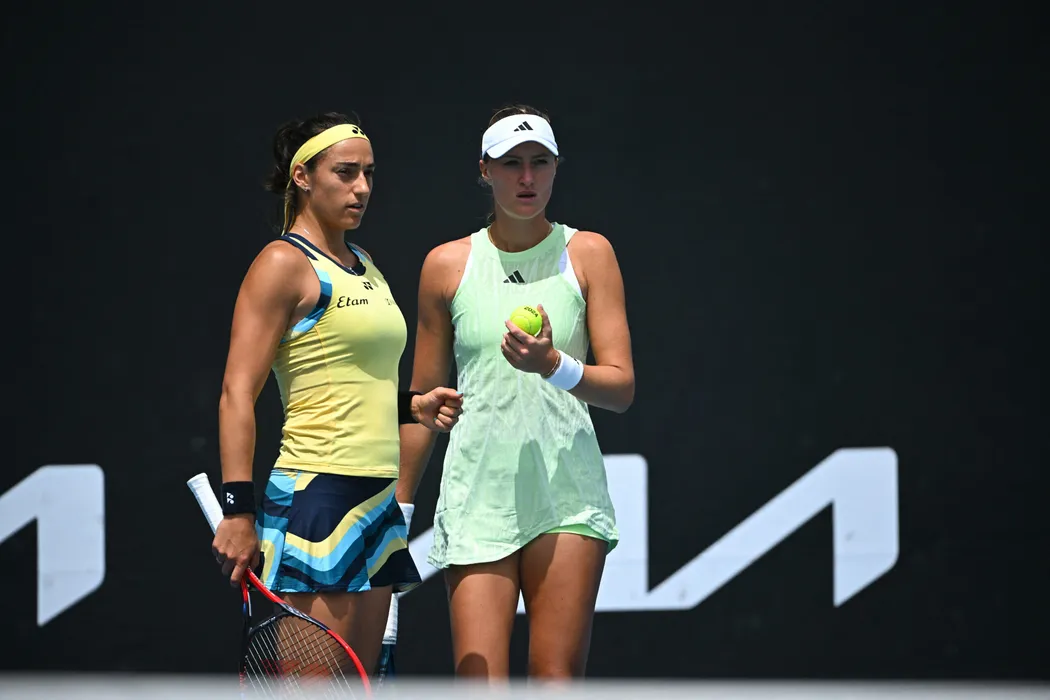 Caroline Garcia (FRA) and Kristina Mladenovic (FRA) during their double match at the 2024 Australian Open at Melbourne Park in Melbourne, Australia, on January 20, 2024. Photo by Corinne Dubreuil/ABACAPRESS.COM