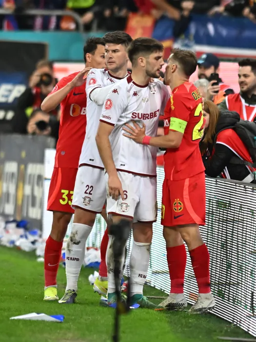 Cristian Ionut Sapunaru, Paul Alexandru Iacob si Darius Dumitru Olaru in meciul de fotbal dintre FCSB si Rapid Bucuresti, din cadrul Play off-ului Superligii Superbet, desfasurat pe Arena Nationala din Bucuresti, sambata 20 aprilie 2024. © FOTO:Razvan Pasarica/SPORT PICTURES