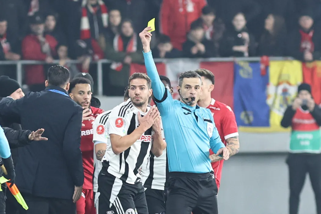 Arbitrul central Florin Andrei acorda un cartonas galben lui Mihaita Alexandru Chipciu in meciul de fotbal dintre Dinamo Bucuresti si Universitatea Cluj, contand pentru SuperLiga Superbet, desfasurat pe Stadionul Arcul de Triumf din Bucuresti, vineri 24 ianuarie 2025. © FOTO: Gheorghe Fluster/SPORT PICTURES