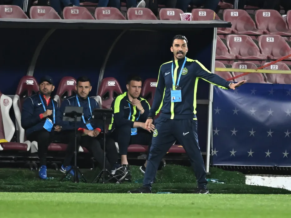Anttrenorii stelisti Lucian Filip, Doru Mihai Pintilii si Elias Charalambous pe banca stelista la meciul de fotbal dintre CFR Cluj si FCSB, contând pentru Play off-ul Superligii Superbet, desfășurat pe Stadionul Dr. Constantin Raduescu din Cluj Napoca, duminica 14 aprilie 2024. © FOTO: Răzvan Pasarica/SPORT PICTURES