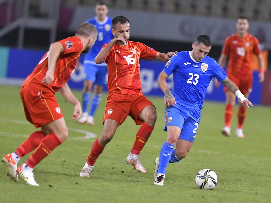 Jani Atanasov si Nicolae Stanciu in meciul de fotbal dintre Macedonia de Nord si Romania, contand pentru Preliminariile CM 2022, desfasurat pe Arena Nationala Todor Proeski din Skopje, miercuri 8 septembrie 2021. © FOTO:Razvan Pasarica/SPORT PICTURES
