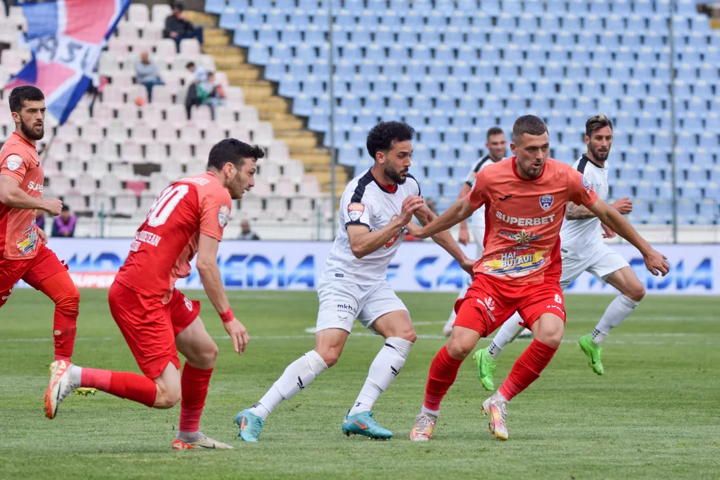 Jebari Soufiane și Ovidiu Perianu, Denis Dumitrașcu în meciul de fotbal dintre Gloria Buzău și AFK Csikszereda Miercurea Ciuc, contând pentru Liga 2 Casa Pariurilor Play-Off, desfășurat pe Stadionul Gloria din Buzău, duminică 21 aprilie 2024. © FOTO: Andrei PIȚIGOI/SPORT PICTURES