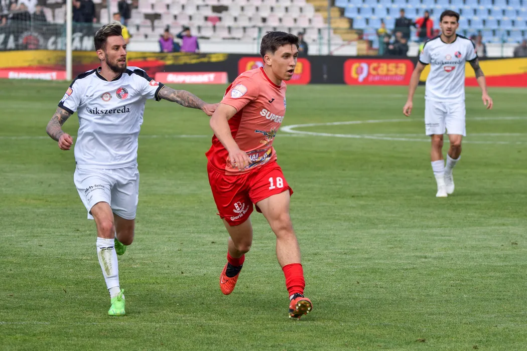 Robert Sălceanu și Janos Nagy în meciul de fotbal dintre Gloria Buzău și AFK Csikszereda Miercurea Ciuc, contând pentru Liga 2 Casa Pariurilor Play-Off, desfășurat pe Stadionul Gloria din Buzău, duminică 21 aprilie 2024. © FOTO: Andrei PIȚIGOI/SPORT PICTURES
