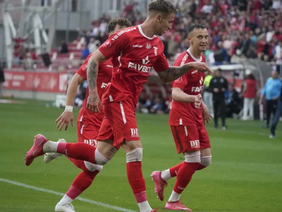 Daniel Zsori se bucura dupa un gol marcat in meciul de fotbal dintre UTA Arad si FC Petrolul Ploiesti, contand pentru Superliga Superbet - Play-Out, desfasurat pe Arena Francisc Neuman din Arad, luni 5 mai 2025. © FOTO: Alexandra Fechete/SPORT PICTURES