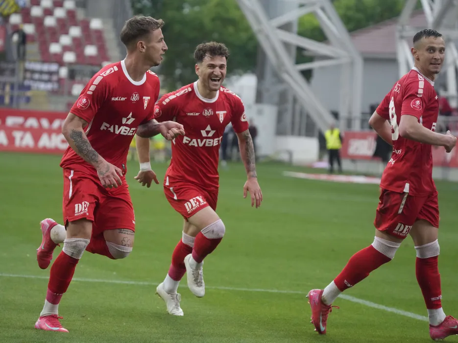 Fotbalistii aradeni Valentin Ionut Costache si Marinos Tzioni se bucura dupa un gol marcat de Daniel Zsori in meciul de fotbal dintre UTA Arad si FC Petrolul Ploiesti, contand pentru Superliga Superbet - Play-Out, desfasurat pe Arena Francisc Neuman din Arad, luni 5 mai 2025. © FOTO: Alexandra Fechete/SPORT PICTURES