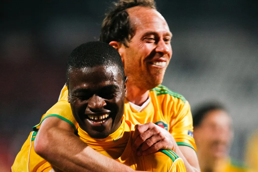 Bello Yero (S) este felicitat de Martins Adailton (D) de la FC Vaslui, dupa inscrierea unui gol in timpul meciului de fotbal contra echipei FC Dinamo Bucuresti, contand pentru etapa a XXIII-a a Ligii I, disputat in Bucuresti, duminica, 25 martie 2012. ALEXANDRU SOLOMON/ MEDIAFAX FOTO