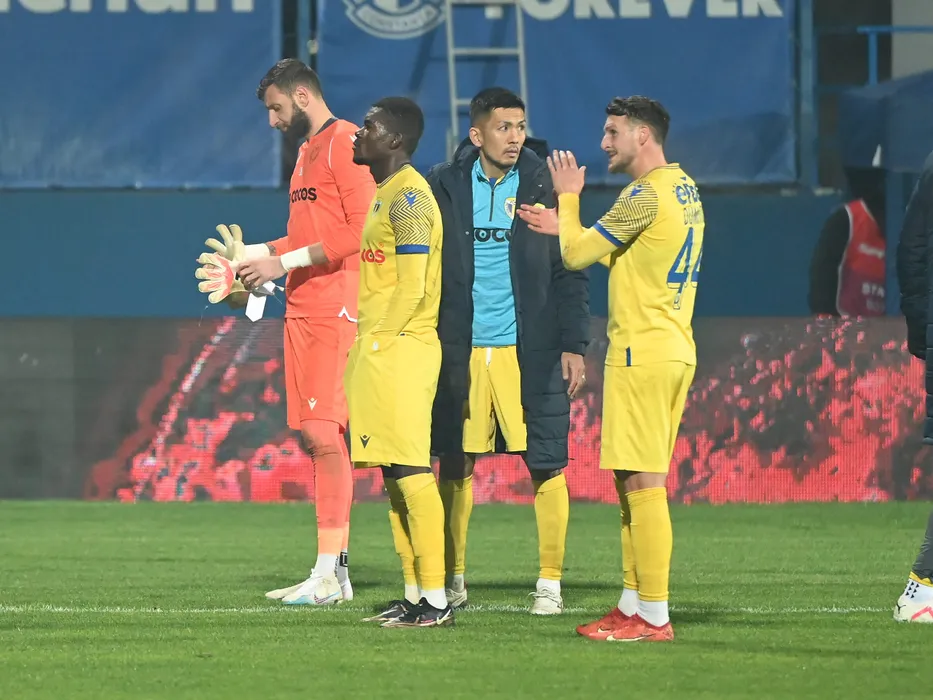 Fotbalistii ploiesteni Lukas Zima, Seniko Romeo Doua, Seto Takayuki si Lucian Mihai Dumitriu saluta galeria dupa meciul de fotbal dintre Farul Constanta si Petrolul Ploiesti, contand pentru Superliga Superbet, desfasurat pe Stadionul central al Academiei Gheorghe Hagi din Ovidiu, duminica 10 decembrie 2023. © FOTO:Razvan Pasarica/SPORT PICTURES