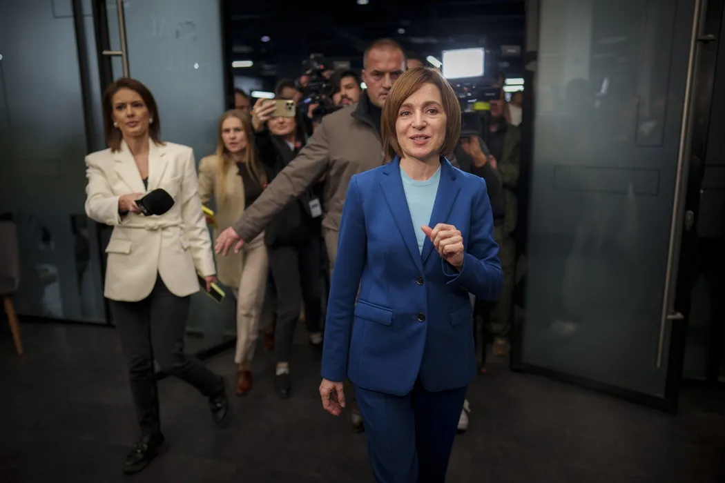Journalists follow Moldova's President Maia Sandu after preliminary results were announced for the presidential election runoff in Chisinau, Moldova, late Sunday, Nov. 3, 2024.,Image: 930093608, License: Rights-managed, Restrictions: This content is intended for editorial use only. For other uses, additional clearances may be required., Model Release: no, Pictured: Maia Sandu