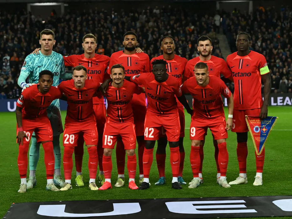 Fotbaliștii steliști la o fotografie de grup realizată înaintea meciului de fotbal dintre Glasgow Rangers si FCSB, din cadrul UEFA Europa League, desfasurat pe Stadionul Ibrox Park din Glasgow, joi 24 octombrie 2024. © FOTO:Razvan Pasarica/SPORT PICTURES