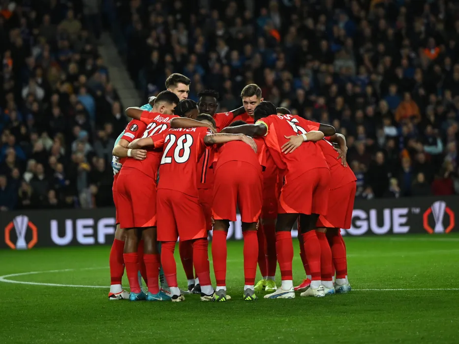 Fotbaliștii steliști se încurajează înaintea meciului de fotbal dintre Glasgow Rangers si FCSB, din cadrul UEFA Europa League, desfasurat pe Stadionul Ibrox Park din Glasgow, joi 24 octombrie 2024. © FOTO:Razvan Pasarica/SPORT PICTURES