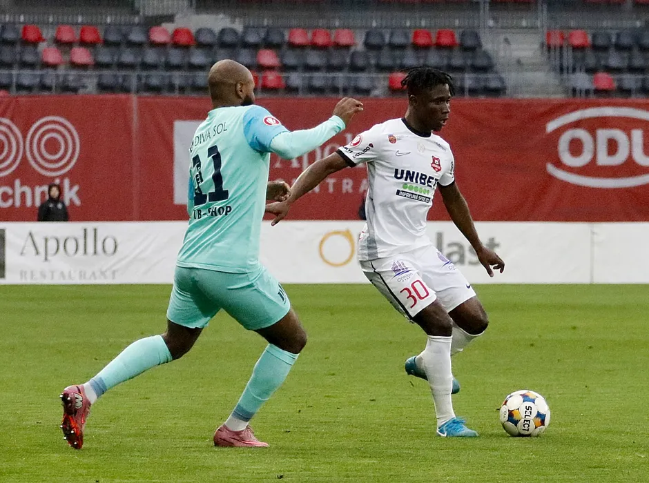 Nana Kwame Antwi si Hakim Djamel Abdallah in meciul de fotbal dintre AFC Hermannstadt Sibiu si UTA Arad, contand pentru Superliga Superbet, desfasurat pe Stadionul Municipal din Sibiu, duminica 30 noiembrie 2025. © FOTO:Valentin Macrea/SPORT PICTURES